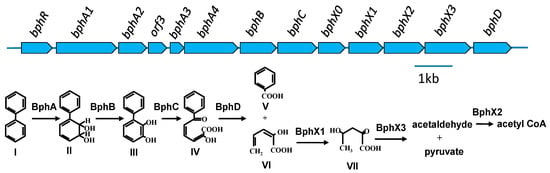 The typical bph gene cluster shown in KF707 is composed of bphRA1A2A3A4BCX0X1X2X3D (Figure 1) []. Briefly, the biphenyl dioxygenase is a multi-component enzyme encoded by bphA1A2A3A4, and it catalyzes the initial oxygenation of biphenyl, converting the biphenyl into dihydrodiol, where bphA1 and bphA2 encode a large and a small subunit of the terminal dioxygenase, respectively. bphA3 encodes ferredoxin, and bphA4 encodes ferredoxin reductase. The dihydrodiol compound is then converted to a dihydroxy-compound by the dehydrogenase encoded by the bphB. The dihydroxy-compound is then degraded into 2-hydroxy-6-oxo-6-phenylhexa-2,4-dienoic acid by the ring-cleavage dioxygenase encoded by the bphC. Then, the ring meta-cleavage compound is degraded into benzoic acid and 2-hydroxypenta-2,4-dienoic acid by the hydrolase (encoded by the bphD). BphX1X2X3 is responsible for the further degradation of 2-hydroxypenta-2,4-dienoic acid into acetyl CoA. These structural bph genes are regulated by the bphR located on the bph gene cluster [,] Among these bph genes, bphA1 is critically important for substrate specificity, i.e., the biodegradation capability for various aromatic compounds, including PCBs [,,].