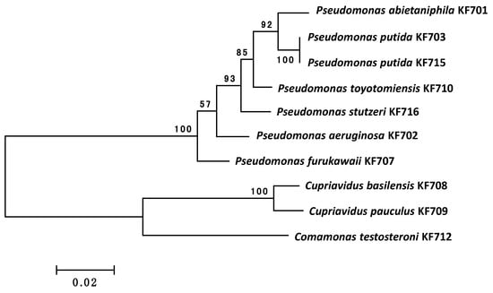 In this study, we found that various types of bph genes were present in the ten biphenyl/PCB degrading strains isolated from the biphenyl-contaminated soil. Figure 2 shows the 16S rRNA phylogenetic tree of the ten strains. Among the ten strains, seven belonged to the Pseudomonas genus, two strains to Cupriavidus spp., and one to Comamonas spp. These were all Gram-negative bacteria belonging to β-proteobacteria (Comamonas and Cupriavidus) and γ-proteobacteria (Pseudomonas). The complete genome sequences were determined for P. furukawaii KF707 and P. putida KF715. KF707 possessed one circular chromosome of 6,242,949 bp and one plasmid (pKF707) of 59,819 bp. On the other hand, P. putida KF715 possessed one circular chromosome of 6,583,376 bp and four plasmids as previously reported in Reference []. The total length of the contigs (total number of contigs, >500 bp) of the remaining strains were as follows: P. abietaniphila KF701, 6,886,250 bp (140) []; P. aeruginosa KF702, 7,167,540 bp (91) []; P. putida KF703, 6,434,897 bp (135) []; C. basilensis KF708, 7,826,077 bp (62) []; C. pauculus KF709, 6,826,799 bp (227) []; P. toyotomiensis KF710, 5,596,721 bp (29) []; C. testosteroni KF712, 5,890,323 bp (97) []; and P. stutzeri KF716, 4,188,013 bp (30) [].
