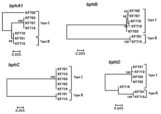The bphA1, bphA2, bphA3, bphA4, bphB, and bphC genes of KF716 were almost identical to that of the type I bph gene. However, the 3’-terminus of the bphX3 gene (754 bp) and 5’-terminus of the bphD gene (260 bp) of KF716 were different from that of type I (Figure S1a,b), and the 5’-terminus of the bphD gene (260 bp) of KF716 was almost identical to that of the type II bph gene. These genetic features are reflected in the phylogenetic tree of the bphD (Figure 3). Thus, the bph genes of KF716 showed the structural features of both groups I and II.