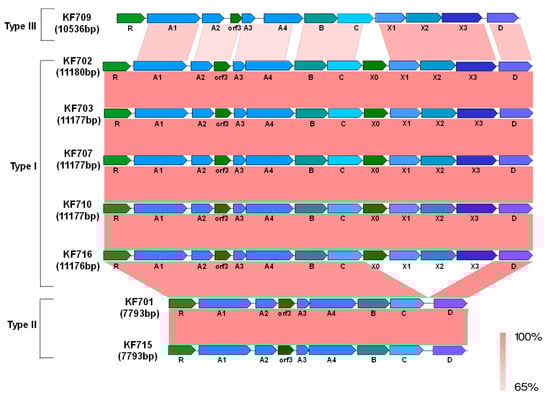 Comparison of the bph gene clusters of KF strains belonging to groups I–III (types I–III). The shading in pink to red shows the identity (65–100%) of the gene clusters as indicated at the bottom of the figure. R, bphR; A1, bphA1; A2, bphA2; A3, bphA3; A4, bphA4; B, bphB; C, bphC; D, bphD; X0, bphX0, X1, bphX1; X2, bphX2; and X3, bphX3.