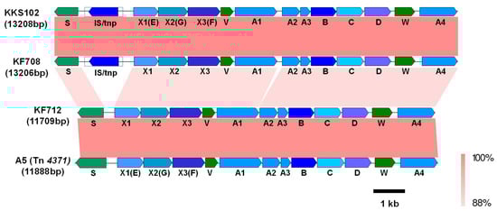 Comparison of the bph genes of Cupriavidus basilensis KF708 and Comamonas testosteroni KF712 belonging to group IV (type IV) to those of Acidovorax sp. KKS102 and Cupriavidus oxalacticus A5. The identities (88–100%) between the gene clusters are shown by shading in pink to red as indicated at the right bottom of the figure. E, bphE; F, bphF; G, bphG; S, bphS; V, bphV; W, bphW; IS, insertion sequence; tnp, transposase. The bphE, bphF, and bphG of KKS102/Tn4371 are homologous genes of bphX1, bphX3, and bphX2 of KF708/KF712, respectively. The other signs are defined in the legend in Figure 4.