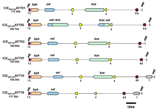 Organization of the ICEbph-sal in KF strains of group I and KF701 of group II. ICEbph-salKF701, ICEbph-salKF702, ICEbph-salKF703, ICEbph-salKF707, and ICEbph-salKF710 carry the int gene, bph genes, sal genes, and bza genes. ICEbph-salKF716 carries the int gene, bph, and sal genes, but not the bza genes. The sal genes and bza genes in ICEbph-salKF702 are recombined. 1, tRNA-Gly(CCC) genes (partial); 2, int genes; 3, VirB4 components of the type IV secretory pathway; 4, VirD4 component of the type IV secretory pathway; 5, parB genes; 6, parA genes; and 7, putative multidrug efflux pumps. The other, undefined gene components are not shown in the figure.