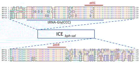 The genome sequence analysis of KF701, KF702, KF703, KF707, KF715, and KF716 revealed highly conserved large “genomic islands” that included the bph-sal genes adjacent to the tRNA-Gly(CCC) gene (Figure 6). There was an 18 bp direct repeat (5’-TTCCC(T/A)(T/C)(C/T)(G/A)CCCGCTCCA-3’) on the border of the conserved region and the non-conserved region (attL and attR, Figure 7). The attL included 18 bp of the 3ʹ end of the tRNA-Gly(CCC) gene. These 18 bp direct repeat sequences could be generated by the integration of genomic islands into the chromosome. In strain KF707, attL was followed by a phage-related integrase (int) gene. The bph cluster was located just downstream of the int gene, followed by the sal gene cluster approximately 6-kb downstream, and by the bza gene approximately 49-kb downstream. The attR site was located downstream of the bza gene. Thus, the genomic island was estimated to be 122.0 kb in size (Figure 6). Genes identified as the VirB4 component (ATPase) and VirD4 component (coupling protein) of the type IV secretory pathway [] were located 40-kb and 80-kb downstream of the tRNA-Gly(CCC) gene, respectively. The parA and parB genes encoding the replication partition proteins were present near the right end, and were proposed to act as a stabilization system for the maintenance of mobile elements in the bacterial genomes []. These structures corresponded to the common backbone of many integrative conjugative elements (ICEs) [], such as ICEclc from Pseudomonas knackmussii B13 [], which carries the catabolic genes of chlorocatechols, the tyrosine integrase gene, and type IV secretory machinery. We designated it as ICEbph-salKF707. Within this element, many putative mobile protein genes were present surrounding the sal gene cluster. To note, five IS genes at the upstream region and two IS genes at the downstream region were identified. ICEbph-sal was observed in other KF strains of group I and KF701 of group II. An ICE including the bph and sal gene clusters of P. aeruginosa KF702, named ICEbph-salKF702, was calculated to be 126.7 kb (Figure 6). Likewise, the ICEbph-salKF703 of P. putida KF703, ICEbph-salKF710 of P. toyotomiensis KF710, and ICEbph-salKF716 of P. stutzeri KF716 were calculated to be 120.8 kb, 130.3 kb, and 117.3 kb, respectively. The ICEbph-salKF701 of P. abietaniphila KF701 in the group II strain was 117.4 kb in size. As in the case of ICEbph-salKF707, ICEbph-salKF701, ICEbph-salKF702, ICEbph-salKF703, and ICEbph-salKF710 contained three gene clusters of bph, sal, and bza. ICEbph-salKF716 contained bph and sal genes, but not the bza genes. Sequence comparison revealed an inversion in ICEbph-salKF702. The sal:bza and bza:sal fusion gene clusters were found, in which half parts of the sal genes and the bza genes were replaced with each other. These fusion genes were likely generated via homologous recombination between the sal and the bza genes. ICEbph-salKF710 and ICEbph-salKF716 contained the 5-kb region encoding putative multidrug efflux pumps, but ICEbph-sals from the remaining KF strains was deficient of the corresponding region. Thus, ICEbph-sal in groups I and II contained highly conserved nucleotide sequences larger than 110 kb, which were larger than many other ICEs found in bacterial strains to date [].
