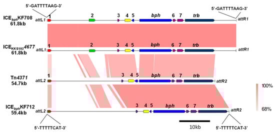 Organization of ICEbphKF708 and ICEbphKF712 in comparison to ICEKKS1024677 and Tn4371. attL1 and attR1 represent integration sites for the ICEbphKF708 and ICEKKS1024677. attL2 and attR2 represent integration sites for the Tn4371 or ICEbphKF712. 1, integrase (int) gene; 2, putative arsenate-resistant gene; 3, parA gene; 4, VirD2 component (relaxase); 5, transcriptional regulator bphS gene; 6, traR gene; and 7, traG gene. The shading in pink to red shows the identities (68–100%) of the gene clusters as indicated at the right bottom of the figure.