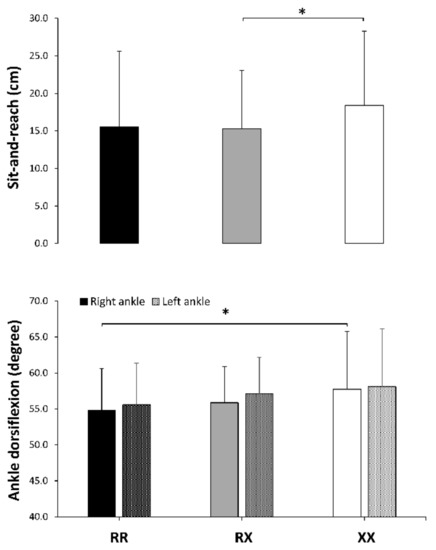 The ANOVA post-hoc analyses revealed that body fat percentage was higher in the XX than in the RR group (Figure 1, upper panel), although the differences between XX and the RR or RX group were small–moderate (Table 2). The ANOVA post-hoc analyses only revealed a small-to-moderate difference between RR and XX groups for thigh volume in the dominant leg (Figure 1, lower panel). By contrast, performance in the sit-and-reach-test was higher in the XX group than in the RX group (Figure 2, upper panel). Post-hoc analyses only revealed an RR vs. XX difference in the right ankle for maximal dorsiflexion during the weight-bearing lunge test (Figure 2, lower panel) with no differences between groups in the left ankle (Table 2).