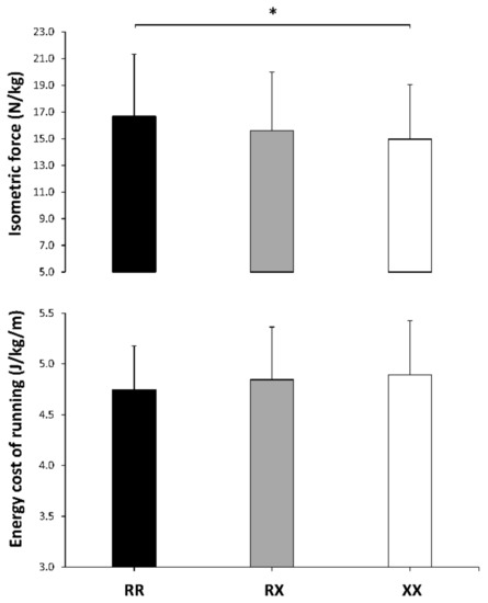 Maximal isometric force and energy cost of running in ACTN3 RR, RX and XX recreational marathon runners. Data are mean ± SD for each genotype. (*) Differences identified by a post-hoc analysis at p < 0.05.