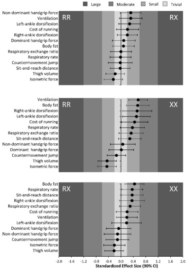 Magnitude of the ACTN3 genotype effect, calculated with Hedges’ g ± 95% confidence interval, on the phenotypes investigated for the comparison of RR vs. RX (upper panel), RR vs. XX (middle panel), and RX vs. XX (lower panel) genotypes. Negative values indicate higher values of the variable for the group categorized at the left. Positive values indicate higher values of the variable for the group categorized at the right.