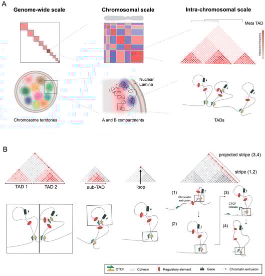 Prominent features observed in Hi-C maps. (A) At a genome wide level, chromosomes are organized according to distinct territories that are reflected by the degree on intra vs. inter-chromosomal interactions. At the chromosomal level, distinct regions are organized into multi-megabase A/B compartments (red/blue) according to transcriptional and epigenetic status. Within compartments, chromatin is organized into TADs (average size of 880 kb) that also show a nested hierarchy into meta-TADs. (B) At the TAD level, multiple features can be observed, such as sub-TADs (average size of 185 kb), loops or stripes/tracks. Squared regions represent the genomic region in the chromatin fiber where chromatin interactions occur and that originates the observed feature. Note, the dynamic nature of extrusion that is associated to the formation of stripes/tracks, where the structures can be extended upon release of individual CCCTC-binding factor (CTCF) molecules from chromatin.