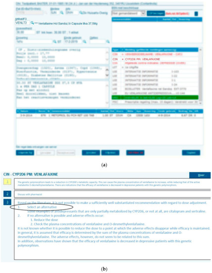 Clinical decision support during drug dispensing. A patient who is CYP2D6 PM (as noted in the electronic medical record (EMR) as contra-indication, as indicated by “CIN” (contra-indication) receives a prescription for venlafaxine (a) which triggers a pop-up with the relevant Dutch Pharmacogenetics Working Group (DPWG) recommendation directing selection of alternative drug (b).