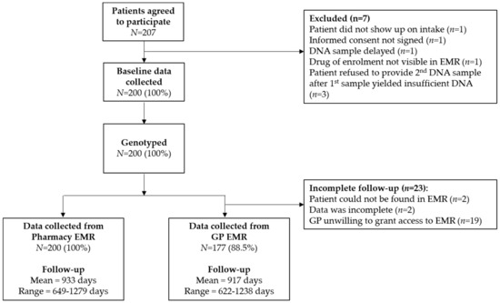 Overall 200 patients were enrolled in the IP3 study between November 2014 and July 2016. Patient characteristics are presented in Table 1. The database containing the genotypes and predicted phenotypes is available at https://databases.lovd.nl/shared/individuals (patient IDs 184080-184279). 62 (31.0%) patients encountered an actionable drug-gene interaction for the drug of enrolment, as previously reported by Bank et al. [29]. Of these, health care providers chose to adhere to the DPWG guideline in 49 (79.0%) cases. Data collection was performed retrospectively between April 2018 and September 2018 in both pharmacy and GP EMRs; from pharmacy EMRs between May 4th 2018 and May 29th 2018; and from GP EMRs between April 3rd 2018 and September 28th 2018. Data could be retrospectively collected cross-sectionally from 200 (100%) and 177 (88.5%) pharmacy and GP EMRs, respectively (see Figure 2). The mean follow-up from pharmacy EMRs was 933 days (range 649–1279), approximately 2.5 years. The mean follow-up from GP EMRs was 917 days (range 622–1238).