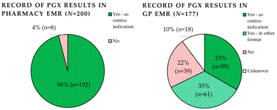General practitioners were able to record the PGx results in 67.8% (n = 120) of patient records. Of these, 34% (n = 59) were recorded as contra-indications and 35% (n = 61) in another format such as a PDF file.