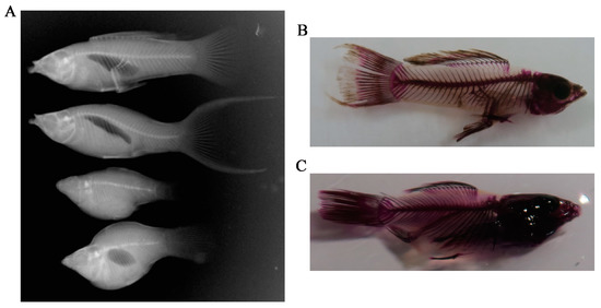 Skeletons of the normal molly and the dwarf molly. (A) Skeletons of normal and dwarf mollies under X-ray radioscopy; (B) skeleton of a normal molly using skeletal staining; (C) skeleton of a dwarf molly using skeletal staining.