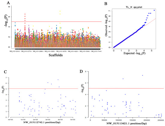 We used GEMMA software [25] to perform genome-wide association studies for the ratio of TL and H using a generalized linear mixed model. The population genetic structure was considered to be a fixed effect and individual kinship was regarded as a random effect in the mixed linear model. The linear mixed model was constructed as follows: