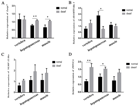 Trait-causing genes often induce changes in gene expression levels, and so the gene expression levels of the five genes, except Bank 1, in the candidate region were determined by qRT-PCR (Figure 5). Bank 1 (B-cell scaffold protein with ankyrin repeats 1) encodes a B-cell-specific scaffold protein, a novel substrate of tyrosine kinases, and its overexpression in B-cells can enhance calcium mobilization induced by B-cell antigen receptor (BCR) stimulation [34]. It has been reported that Bank 1 is associated with systemic lupus erythematosus (SLE) [35,36]. The expression levels of the Bank 1 gene were too low to be accurately determined in the three tissues examined in the present study, so no expression data of the Bank 1 gene is shown here. There was no difference in the expression level of the NLRP 12-like gene between DWMs and NWMs in the vertebrae, hepatopancreas or muscle (Figure 5A). ADAMTS-like proteins may be enhancers of the ADAMTS proteases [37]. The ADAMTS-like 1 gene, also known as C9orf94, PUNCTIN, ADAMTSR1 or ADAMTSL-1 in humans, encodes a novel ADAMTS-like molecule which lacks the typical domains of the ADAMTS family and is composed of only ADAMTS ancillary domains in the extracellular matrix [37]. A significant difference (p < 0.05) between the expression levels of ADAMTS-like 1 in DWMs and NWMs was observed in the hepatopancreas, with the value observed for NWMs being greater than that observed for DWMs, but no difference was found in the vertebrae or muscle (Figure 5B). The Larp7 gene encodes a member of the ribonucleoprotein domain family 7, which is a unit of the ribonucleoprotein complex 7SK snRNP. Some studies have suggested that Larp7 mutations cause dwarf phenotypes [38,39,40]. Alamazi et al. [38] found that a seven-base homozygous repeat (c.1024_1030dupAAGGATA, p.T344K) on exon 8 of the Larp7 gene, which causes a frameshift mutation and prematurely terminates translation, is an underlying mechanism of primordial dwarfism (PD), which is characterized by embryonic growth degeneration, facial deformity and mental impairment. Recently, two more mutations (c.1091_1094delCGGT and c.1045_1051dupAAGGATA) on the Larp7 gene have been associated with PD [39]. In zebrafish, Larp7 has also been found to play a crucial role in embryo development [40]. In the present study, the expression of the Larp7 gene in DWMs was significantly higher (p < 0.05) than that in NWMs in the hepatopancreas and muscle, but not in the vertebrae (Figure 5C). PPP3CA encodes the alpha isoform of a subunit of calcineurin and is involved in neurodevelopmental diseases and systemic lupus erythematosus [35,36]. The expression of the PPP3CA gene in the hepatopancreas and vertebrae of DWMs was significantly (p < 0.05) or extremely significantly (p < 0.01) higher than that in NWMs (Figure 5D). The data also showed that DWMs possessed a higher expression level of the PPP3CA gene in muscle compared with NWMs, despite the fact that the difference was not significant (Figure 5D; p = 0.16).