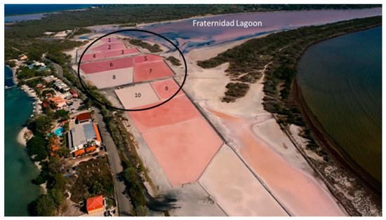 Aerial map of the Solar Salterns of Cabo Rojo (17°57′25.2″ N, 67°11′58.0″ W). Water samples (5 L) were obtained from ten crystallizers (circled in black) and pooled together into one sample (50 L). Three samplings were performed on the same crystallizers in rainy (December 2014), and dry (March and July 2016) seasons. Photo taken by “Puerto Rico desde el Aire” reproduced with permission.