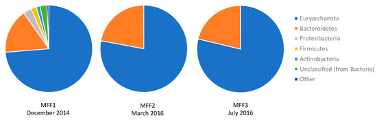 Taxonomic hits by phylum. Each slice indicates the number of reads with predicted 16SrRNA genes annotated to the indicated phylum. Samples were named MFF1 for the first sampling, MFF2 for the second sampling and MFF3 for the third sampling (MFF stands for “Muestra Final Fraternidad” which means Fraternidad Final Sample). Phylum Euryarchaeota were shown to be dominant in the three samples (73.69% for MFF1, 77.92% for MFF2, and 78.75% for MFF3), followed by Bacteroidetes (16.59, 22.03, 21.18%, respectively), and Proteobacteria (3.03, 0.05, 0.07%, respectively). Other groups include Acidobacteria, Chlamydiae, Cyanobacteria, Deinococcus-Thermus, Fusobacteria, Planctomycetes, and Verrucomicrobia, with less than 1% in MFF1.