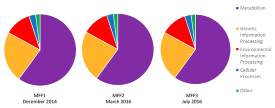 KEGG Orthology (KO) of functional genes obtained from samples MFF1, MFF2, and MFF3. Genes related to metabolism dominate in about 60% of the sequences in all three samples, followed by genetic information processing (23%), environmental information processing (12%), and cellular processes (3%). Other funtions are less than 1%. Samples were named MFF1 for the first sampling, MFF2 for the second sampling, and MFF3 for the third sampling (MFF stands for “Muestra Final Fraternidad” which means Fraternidad Final Sample).