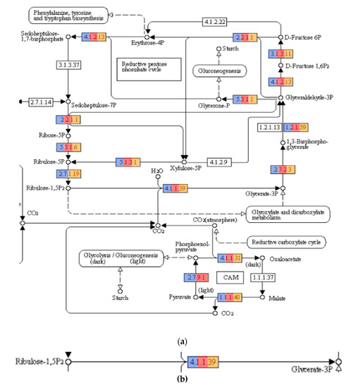 (a) Carbon metabolism pathways detected in the three metagenomes. Colored enzymes indicate the presence of the enzyme, light blue indicates presence in MFF1, red indicates presence in MFF2, and orange indicates presence in MFF3 (number of hits for each enzyme can be seen at Table S1 of supplementary figures). (b) Reaction catalyzed by the enzyme Ribulose-1,5-bisphosphate carboxylase/oxygenase (RuBisCO). The enzyme is present in all three metagenomes. Pathways obtained from KEGG pathways (https://www.genome.jp/kegg/pathway.html) with permission.