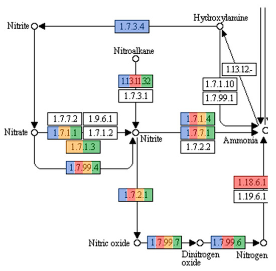 Nitrogen metabolism pathways present in the three metagenomes. Colored enzymes (Light blue and green for MFF1, red for MFF2, orange for MFF3) indicate the presence of hits related to the enzyme in the metagenome (number of hits for each enzyme can be seen at Table S1 of supplementary figures). Enzymes related to reductive pathways in the nitrogen cycle were encountered, including nitrate reductase (Enzyme Nomenclature database numbers (EC) 1.7.1.1, 1.7.1.3, 1.7.99.4), nitrite reductases (EC 1.7.2.1, 1.7.7.1, 1.7.1.4), and the nitrogenase needed for nitrogen fixation (EC 1.18.6.1). Pathways obtained from KEGG pathways (https://www.genome.jp/kegg/pathway.html) with permission.