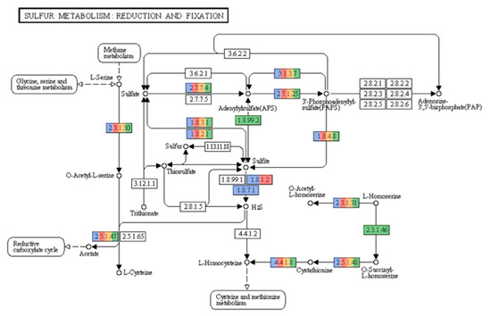 Sulfur metabolism pathways present in the metagenomes. Colored enzymes indicate the presence of hits related to the enzyme in the metagenome (number of hits for each enzyme can be seen at Table S1 of supplementary figures). Enzymes related to sulfate reduction (2.7.7.4, 1.8.99.2, 1.8.1.2, 1.8.7.1) were encountered. Pathways obtained from KEGG pathways (https://www.genome.jp/kegg/pathway.html) with permission.