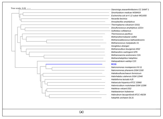 (a) Phylogeny for RC33 using amino acid identity. The scale represents change of amino acid substitution over time. (b) Subsystem category distribution for RC33. The graph represents the number of proteins that were grouped into a specific subsystems; 883 from a total 1570 coding sequences were identified to fit into subsystems. This chart was generated using Rapid Annotation System Technology (RAST).
