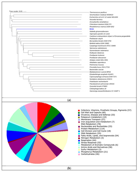(a) Phylogeny for RC24 using AAI. The scale represents the number of amino acid substitutions over time. (b) Subsystem category distribution for RC24. The graph represents the number of proteins that were grouped into a specific subsystem; 723 of 1561 coding sequences were identified to fit into subsystems. This chart was generated using Rapid Annotation System Technology (RAST).