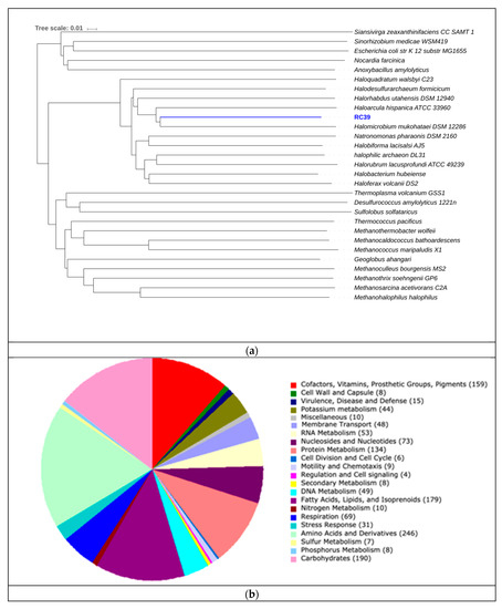 (a) Phylogeny for RC39 using AAI. The scale represents the number of amino acid substitutions over time. (b) Subsystem category distribution for RC39. The graph represents the number of proteins that were grouped into a specific subsystems; 1366 of 2439 coding sequences were identified to fit into subsystems. This chart was generated using Rapid Annotation System Technology (RAST).