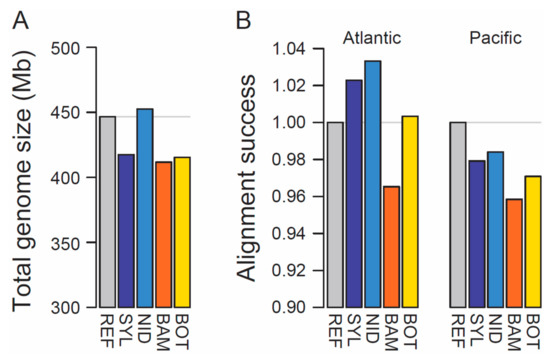 (A) Total ungapped length of the reference (REF) stickleback genome and the four new assemblies (SYL, Atlantic marine; NID, Atlantic freshwater; BAM, Pacific marine; BOT, Pacific freshwater). (B) Alignment success of whole-genome sequence reads from an Atlantic (left, NID) and a Pacific (right, Misty Lake) freshwater population when matched to each of the five assemblies, standardized by the alignment success achieved with the reference genome. Note that in both (A) and (B), the y-axis is strongly truncated to increase visual resolution in the upper range of the scale. The gray horizontal lines indicate the values for the reference genome.