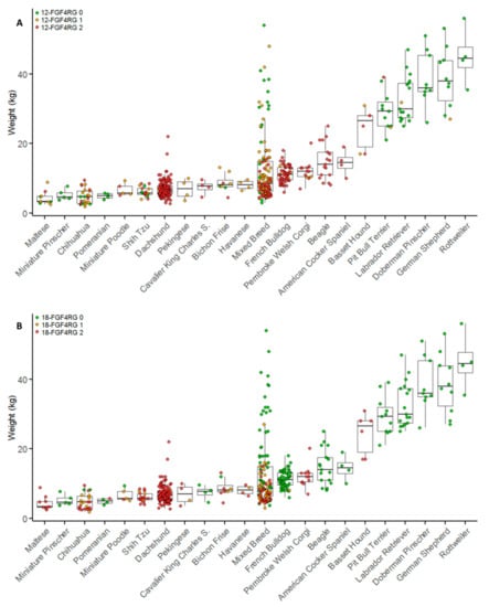 Breed and genotype distribution of surgical IVDD cases by body weight. Breeds with fewer than four cases are not included in this figure. Breeds are plotted in order of ascending median weights and colored by 12-FGF4RG genotype (A) and 18-FGF4RG genotype (B) n = 510). Red indicates two copies of each retrogene, orange indicates one copy, and green indicates zero copies.