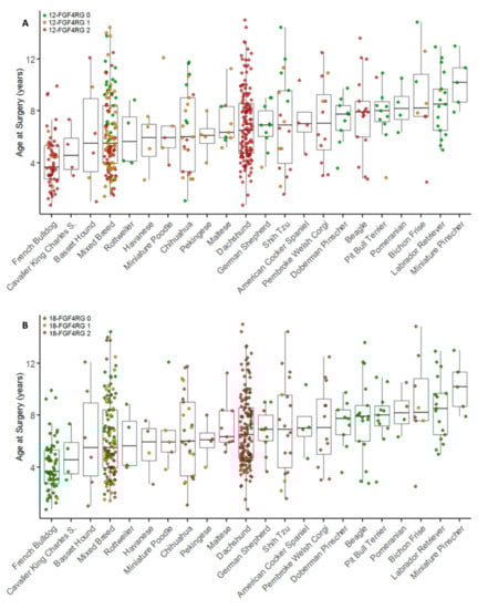Surgeries were primarily performed at the thoracolumbar region, with 413 (72.6%) surgeries performed between T9 and L6, 143 (25.1%) between C1 and T1 and 13 (2.3%) at the lumbosacral junction. Anatomical localization of surgical procedure as a percentage of all surgeries performed for each genotype category is shown in Supplementary Figure S1. The age at first surgery for breeds with more than four surgical cases compared with 12-FGF4RG and 18-FGF4RG genotypes is presented in Figure 2.