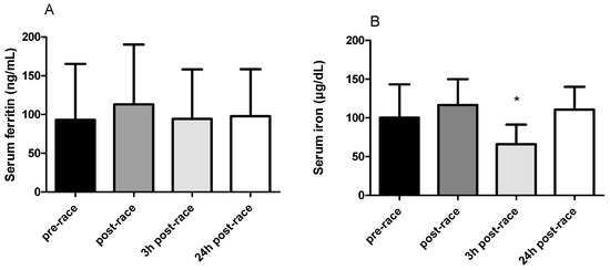 Serum ferritin (A) and iron (B) concentrations at different time points in the 24 participants. Values are presented as mean ± SD. * p < 0.05 compared to the pre-race value.