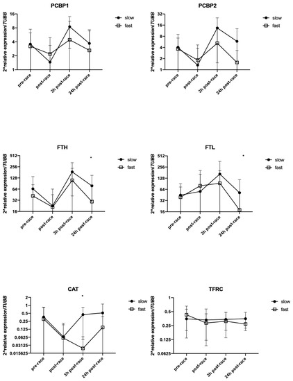 The direction of change in PCBP1, PCBP2 and FTH gene expression were the same i.e., a decrease immediately after the race and a statistically significant increase 3 h post-race. At 24 h post-race, the values returned almost to baseline (Figure 3). FTL mRNA levels were more stable than FTH mRNA levels between the end of the run and 3 h post-race. However, similarly to FTH, a significant difference in FTL mRNA levels between groups was observed 24 h after the race (p = 0.0245 and p = 0.0128, respectively). The slow group presented with higher levels than the fast group. The opposite changes were observed in CAT mRNA levels at 3 h post-race. In the slow group CAT mRNA levels dropped, while they increased in the fast pace group (p = 0.0017).