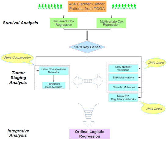 Figure 1). First, through large-scale Cox regression models (i.e., univariate and multivariate Cox regression), we identified 1078 survival-related genes according to their impact on the survival status of 404 bladder cancer patients obtained from TCGA. As a bridge connecting survival and tumor staging, the cooperative patterns of these survival-related genes in different stages were particularly analyzed. Next, we focused on these 1078 genes and analyzed the relationships between the progression of bladder cancer and several related genomic factors, including gene co-expression networks, functional gene modules, copy number variations, DNA methylations, somatic mutations and microRNA regulatory networks. Finally, we performed an integrative analysis on the joint effect of multiple biological factors on the staging of bladder cancer. Overall, our study provided a systematic and reasonable pipeline to integratively analyze the genomic and clinical data and reveal the intrinsic genomic characteristics of the progression of bladder cancer.