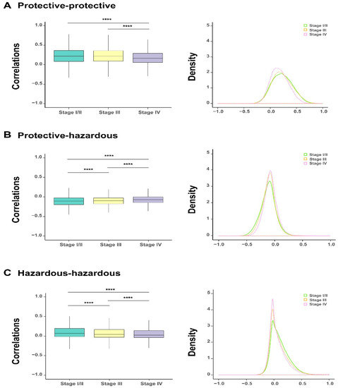 The above survival analysis has divided the 1078 survival-related genes into two groups, including protective and hazardous genes. To investigate the correlation between the expression of genes within or between these two gene groups during the evolution of bladder cancer, we analyzed the correlation coefficients of expression values between protective and protective genes, protective and hazardous genes, and hazardous and hazardous genes at each tumor stage. The comparisons showed that as the severity of bladder cancer enhanced (i.e., along the order of stage I/II, stage III, and stage IV), a significant decline was observed in the correlations within either homogeneous genes (i.e., between protective and protective or hazardous and hazardous genes) or heterogeneous ones (i.e., between protective and hazardous genes) (
