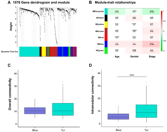Figure 4B). As tumor progression is generally closely related to the survival of patients, we particularly looked into those gene modules that were associated with the tumor stages. We observed two gene modules (labeled in blue and turquoise colors in