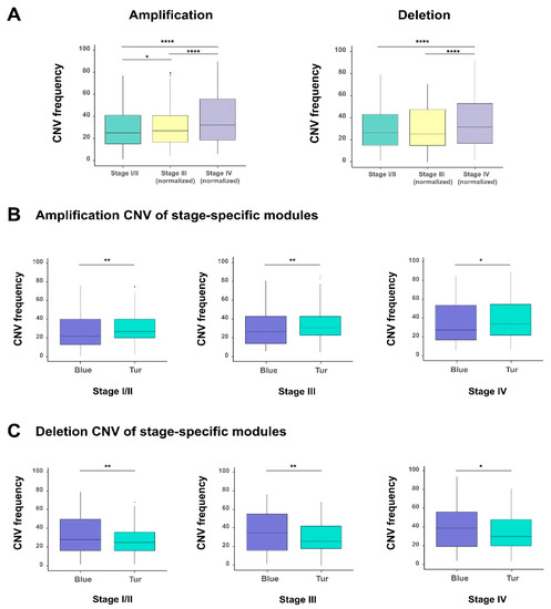 Figure 4B) which had the most positive and negative correlations with the stages of bladder cancer, respectively. Interestingly, with the tumor staging, we observed that the turquoise module (in which the 93% of genes were protective) displayed significantly higher amplification CNV frequencies than the blue module (in which all genes are hazardous genes) (