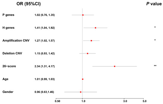 To obtain a holistic understanding on the effects of different genomic and clinical factors on the evolution of bladder cancer, we further performed an integrative analysis of these factors, using an ordinal logistic regression model (see Materials and Methods). In particular, we considered the average values of the protective and hazardous genes, the frequency of copy number variations (amplification and deletion), the risk scores of DNA methylation, age, and gender in our integrative analysis. As shown in the forest plot in