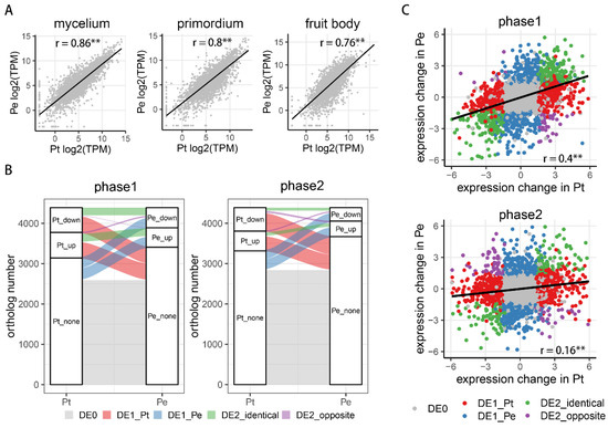 - Plaza, D.F.; Lin, C.-W.; van der Velden, N.S.J.; Aebi, M.; Künzler, M. Comparative transcriptomics of the model mushroom Coprinopsis cinerea reveals tissue-specific armories and a conserved circuitry for sexual development. BMC Genom. 2014, 15, 492. [Google Scholar] [CrossRef]