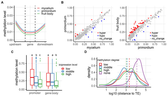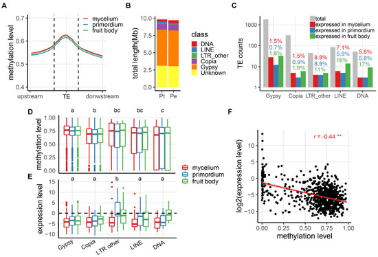 3.3. Correlation Between CG Methylation and Expression of TEs during Development in the Two Mushroom Species