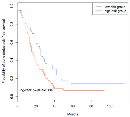 In the test data set, 71 patients were predicted as high-risk patients, and 98 patients were predicted as low-risk patients. Survival analysis showed that the bone-metastasis risks of the patients in the two groups were indeed different, with a p-value of 0.007 (Figure 1).