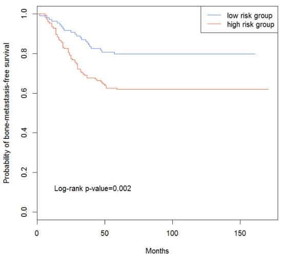 Among the 286 patients in the independent test set, 117 were classified as high-risk patients, and 169 patients were classified as low-risk patients. The p-value of the log-rank test of the patients in the two groups was 0.002 (Figure 2), indicating that the low-risk patients predicted by our method had longer survival time (bone-metastasis-free survival) than the high-risk ones.