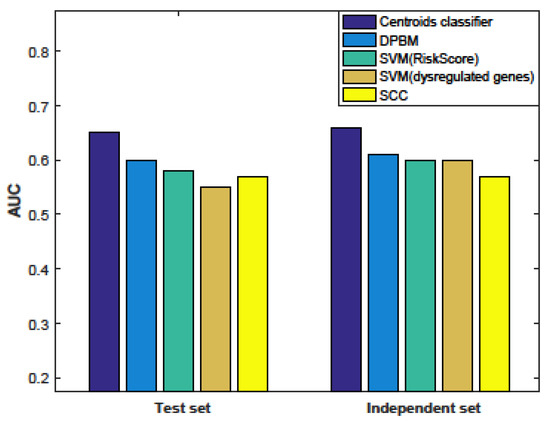 The AUC (area under the curve) of the four classifiers in the test data set and independent data set are shown in Figure 3 (the details of the performance are shown in Table S3). As a result, our centroid classifier could achieve AUCs of 0.65 and 0.66 in the two data sets, respectively, while the best AUC of all the other methods was about 0.60. That is, our centroid classifier outperformed other methods and our method dramatically improved the predictive performance in bone metastasis.