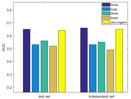 We made predictions based on our signature genes in other organ metastases (lung, liver, brain, and any organs) to verify the specificity of bone metastasis. We calculated the AUC and accuracy of five organs in the training, test, and independent data sets. The results are shown in Table S4 and Figure 4. We found that our signature had very limited predictive ability for each of the other organs. In addition, the performance of metastasis prediction in any organs (the traditional overall survival or distant-metastasis-free survival) was good, but slightly worse than bone-metastasis prediction. This is because most of the organ metastases are bone metastases. This illustrates that our signature genes have specificity for bone metastasis. Moreover, it has been reported that the status of a single gene (e.g., estrogen receptor (ER)) can distinguish the bone-metastasis risk in breast cancer [50], so we also compared the performance of ER status and our method in evaluating the risk of bone metastasis of breast cancer. Since ER status listed in the data set is not a continuous risk score but a discrete status, we used the MCC (Matthews correlation coefficient), which is a classification evaluation index for unbalanced data sets, to evaluate the performance of our signature and ER status (Table 3). The results show that our method was better than the use of single genes (e.g., ER status) in classification. Therefore, our gene signature performed better than a traditional clinical index (i.e., ER status) and had specificity for bone metastasis.