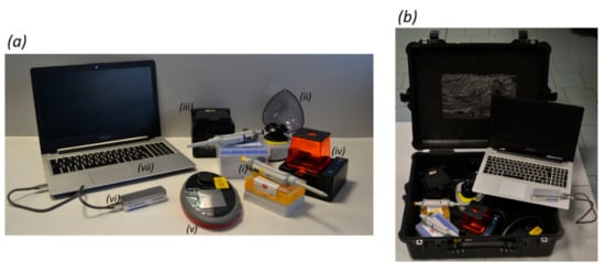 The portable genomics laboratory. Panel (a) shows the equipment comprising the portable genomics laboratory, namely (i) micropipettes, (ii) a mini-microcentrifuge, (iii) a thermal cycler, (iv) an electrophoresis system, (v) a fluorometer, (vi) the nanopore sequencer MinION, and (vii) a laptop. Panel (b) shows how the laboratory is transported.