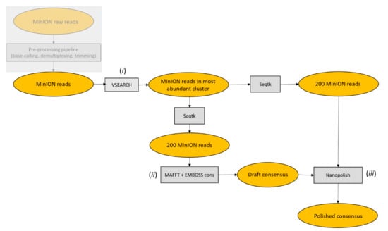 ONTrack pipeline flowchart. (i) MinION reads were clustered at 70% identity using VSEARCH and only reads in the most abundant cluster were retained for subsequent analysis. (ii) Next, 200 reads were then subsampled by Seqtk, aligned with MAFFT and a draft consensus was extracted with EMBOSS cons. (iii) The draft consensus sequence was then polished using Nanopolish, based on a second set of 200 randomly sampled reads.
