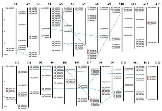 Chromosomal location and gene duplication events of 198 POD genes on 26 upland cotton chromosomes. Chromosome types and numbers are indicated at the top of each bar. The scale on the left is in mega-bases. The gene ID on the left side of each chromosome correspond to the approximate locations of each POD gene. The segmentally duplicated genes are connected by dashed blue lines, and the tandemly duplicated gene clusters are marked by red square bracket with dashed line.