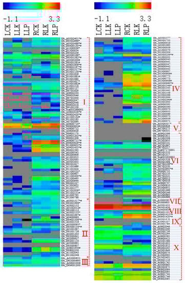 PODs are expressed in different patterns when facing different biotic and abiotic stresses [19,23,34,35]. This was also confirmed in roots and leaves when plants were subjected to K or P deficiency. For example, expression level of gene Gh_D10G1158 decreased obviously in roots under K deficiency and was about 30% of the controls; under P deficiency, its expression was increased obviously and was 202% as much as controls. Conversely, its expression level was increased by 20.9-fold in the leaf under K deficiency, but very few of them show expression changes under P deficiency. Additionally, different subfamily genes showed obviously different responses to K or P deficiency. In comparison with the controls, 16.7% and 45.2% of GhPOD genes had, respectively, more than 2 and less than 0.5 times the expression level in the root under K deficit in the I subfamily; 48.0% and 33.3% of GhPOD genes had, respectively, more than 2 and less than 0.5 times the expression level in the root under P deficit in the I subfamily. Interestingly, few GhPOD genes with higher expression level with FPKM > 30 showed changes of more than 2 or less than 0.5 times in leaf or root under K or P deficit, indicating that these genes play important roles in the maintenance of basic plant growth.