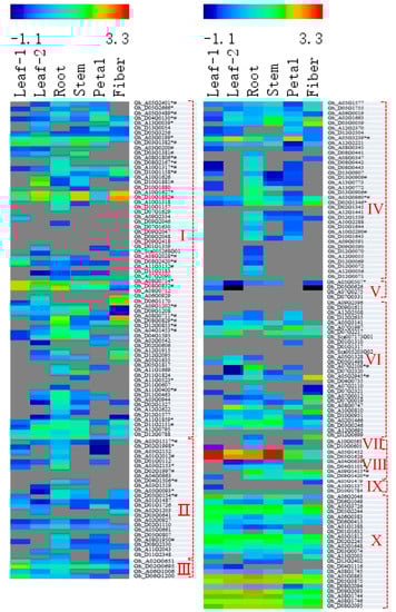 Gene expression patterns can provide important clues about gene function. We used publicly available [20] (https://www.ncbi.nlm.nih.gov/sra/?term=PRJNA248163) and our own genome-wide transcripts profiling data from upland cotton tissues as a resource to investigate the expression patterns of GhPODs. Based on the public data, 28 of the 198 identified GhPOD genes were not expressed in leaves, roots, stems, petals or fibers (Figure 4 and Figure 5), indicating their functional loss among all organs. In comparison between our results and the results of public data by using data from normal culture conditions, 56, 35, and 19 of the 198 GhPOD genes, respectively, exhibited no expression in leaves or/and roots (Figure 4 and Figure 5). It indicated that a part of GhPODs are expressed coincidently under different conditions or at different developmental stages. Few POD genes demonstrate tissue or organ specificity. In the Arabidopsis genome, 73 POD genes have been annotated, 65 of which were expressed in various tissues, and only three (AtPrx12, AtPrx62, AtPrx65) identified as specific to roots [33]. In the upland cotton genome, 17 of 198 POD genes were identified as specific to roots. However, only 4 and 1 were expressed in leaves and fibers, respectively (Figure 4 and Figure 5).