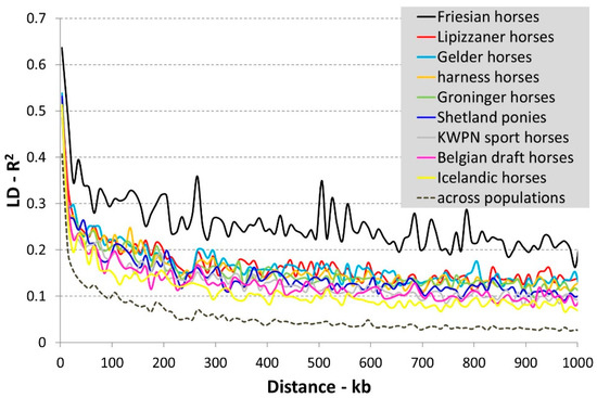 We determined the extent and diminishing of LD within each population, as among other things it shapes haplotypes, is related to the effective population size and is of importance in association studies. LD between all SNPs on a randomly chosen chromosome (ECA2) using genotype data was calculated with the r2 command in PLINK software (version 1.9) [15,16]. To determine the diminishing of LD with increasing physical distance between SNPs, mean LD was expressed as a function of distance. For that purpose, pairs of SNPs were separated into bins of 10 kb in size according to the intermarker distance. Subsequently, mean LD and distance was calculated per (non-overlapping) bin of 10 kb.