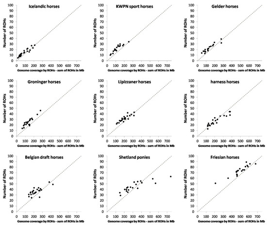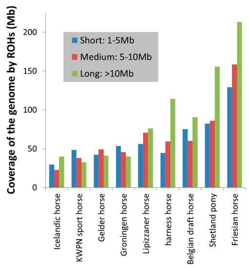 The number and length of ROHs are in agreement with the known demography of the populations. Population bottlenecks seriously increased the number of ROHs identified within a population. The Friesian horse population stood out in mean number of ROHs. This is in line with the breeding history of Friesian horses [8], showing several periods during which the breeding population was much smaller compared to the current active breeding population [8,26,27].